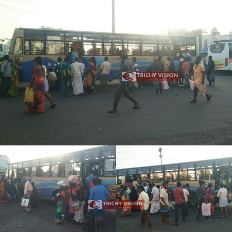 மேலும் திருச்சியிலிருந்து மதுரை செல்லக்கூடிய பேருந்துகள் குறைவான அளவில் இயக்கப்பட்டதால் பேருந்து பயணிகள் நீண்ட நேரம் காத்திருக்க வேண்டிய சூழல் ஏற்பட்டது. மேலும் திருச்சியில் இருந்து மதுரைக்கு செல்வதற்கு பேருந்துகளில் இடம் பிடிப்பதற்கு பயணிகள் முண்டியடித்துக்கொண்டு படிக்கட்டில் தொற்றிக் கொண்டு பெரும் சிரமத்திற்கு ஆளாகினர்.