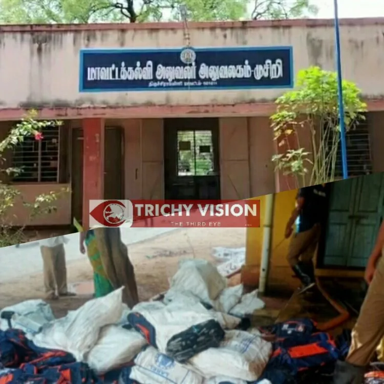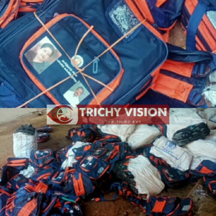 இதனை கண்ட முசிறி கல்வி மாவட்ட அலுவலர் செல்வி முசிறி தீயணைப்பு நிலையத்திற்கு தகவல் தெரிவித்தார். சம்பவ இடத்திற்கு வந்த தீயணைப்பு வீரர்கள் தீயை மேலும் பரவாமல் தண்ணீரை பீச்சி அடித்து அணைத்தனர். இந்த தீ விபத்தில் கடந்தாண்டு வழங்கியது போக எஞ்சியிருந்த பிளாஸ்டிக் பைகள் மின்கசிவு காரணமாக தீ பிடித்து எரிந்தது தெரியவந்தது.