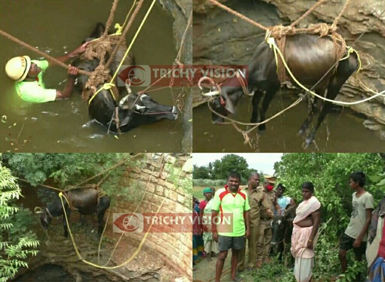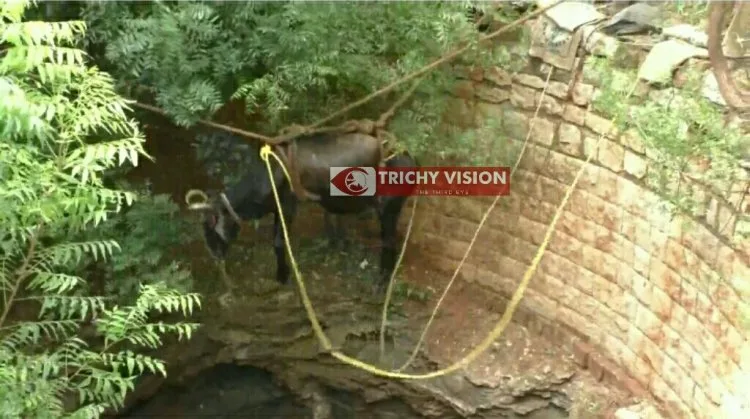 திருச்சி மாவட்டம் மணப்பாறை அடுத்த கரும்புளிப்பட்டியை சேர்ந்தவர் விவசாயி சங்கர். இவர் கால்நடைகளையும் வளர்த்து வருகின்றனர். இந்நிலையில் காலையில் வீட்டின் அருகே மேய்ச்சலில் இருந்த கால்நடைகளில் பசு ஒன்று அருகிலிருந்த 50 அடி ஆழ கிணற்றில் தவறி விழுந்தது.