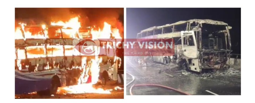 திருநெல்வேலியில் இருந்து செந்தூர் வேலன் டிராவல்ஸ் என்ற ஆம்னி தனியார் பேருந்து திசையன்விளையில் இருந்து சென்னை நோக்கி சென்றுள்ளது. 27 பயணிகளுடன் சென்னை நோக்கிச் சென்ற இந்த தனியார் பேருந்து, திருச்சி மன்னார்புரம் மேம்பாலத்தை கடந்த போது திடீரென டயர் வெடித்து தீப்பிடித்து எரிய தொடங்கியது.