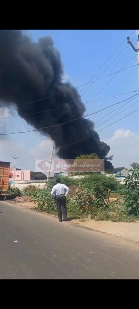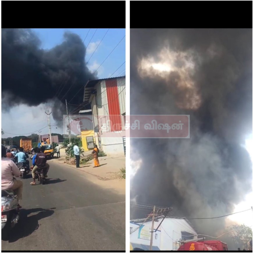 இந்த குடோனில் பழைய இரும்பு பொருட்கள் பிளாஸ்டிக் பொருட்கள் உள்ளது. தீ பற்றி எரிவதால் அந்த கரும்புகை பல அடி உயரத்திற்கு வானில் சென்று கொண்டிருக்கிறது. கரும்புகை அதிக அளவில் வெளியேறுவதால் அப்பகுதியில் செல்லும் வாகன ஓட்டிகள் பெரும் சிரமப்படுகின்றனர். தீயணைப்பு வீரர்கள் தொடர்ந்து தீயை அணைக்க போராடி வருகின்றனர்.திருச்சி தஞ்சை தேசிய நெடுஞ்சாலையில் செல்வோர் வானை நோக்கி செல்லும் கரும் புகையை தங்களது கைபேசிகளில் படம் பிடித்து செல்கின்றனர். ஏராளமான பொதுமக்கள் அங்கே கூடி விட்டனர். காவல்துறையினர் பாதுகாப்பு ஈடுபட்டுள்ளனர். எஸ்.ஐ.டி சுற்றுவட்டார பகுதியில் உள்ள மக்கள் வீட்டை விட்டு வெளியில் வந்து கரும்புகள் வெளியேறுவதை மிகுந்த அச்சத்துடன் பார்த்து வருகின்றனர்.