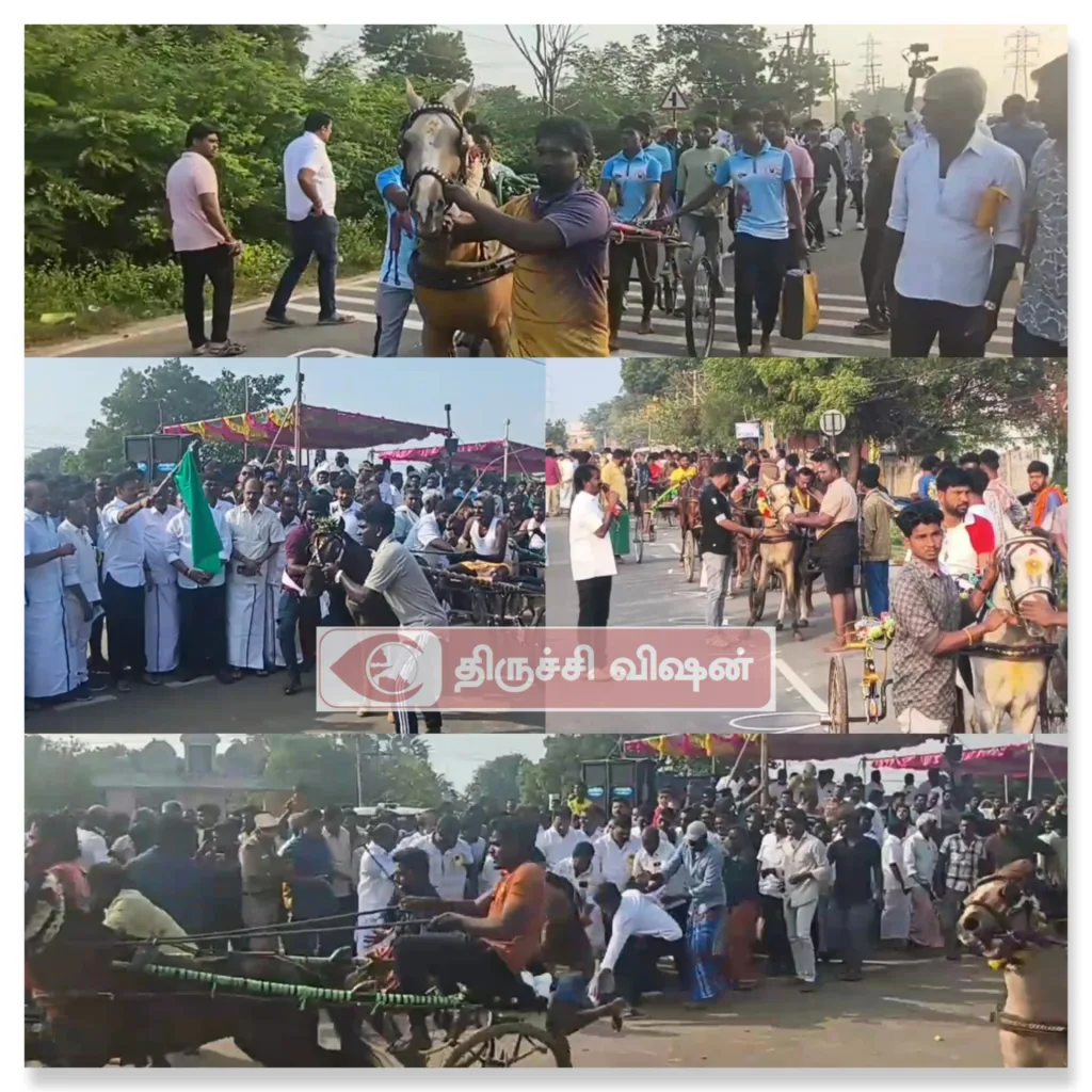 திருச்சி திருவெறும்பூர் அடுத்த குண்டூர் பகுதியில் உள்ள 100 அடி சாலையில், தமிழ்நாடு மாநில குதிரை உரிமையாளர்கள் மற்றும் சாரதிகள் நலச்சங்கத்தின் சார்பில் முதலாம் ஆண்டு குதிரை பந்தயம் நடந்தது.