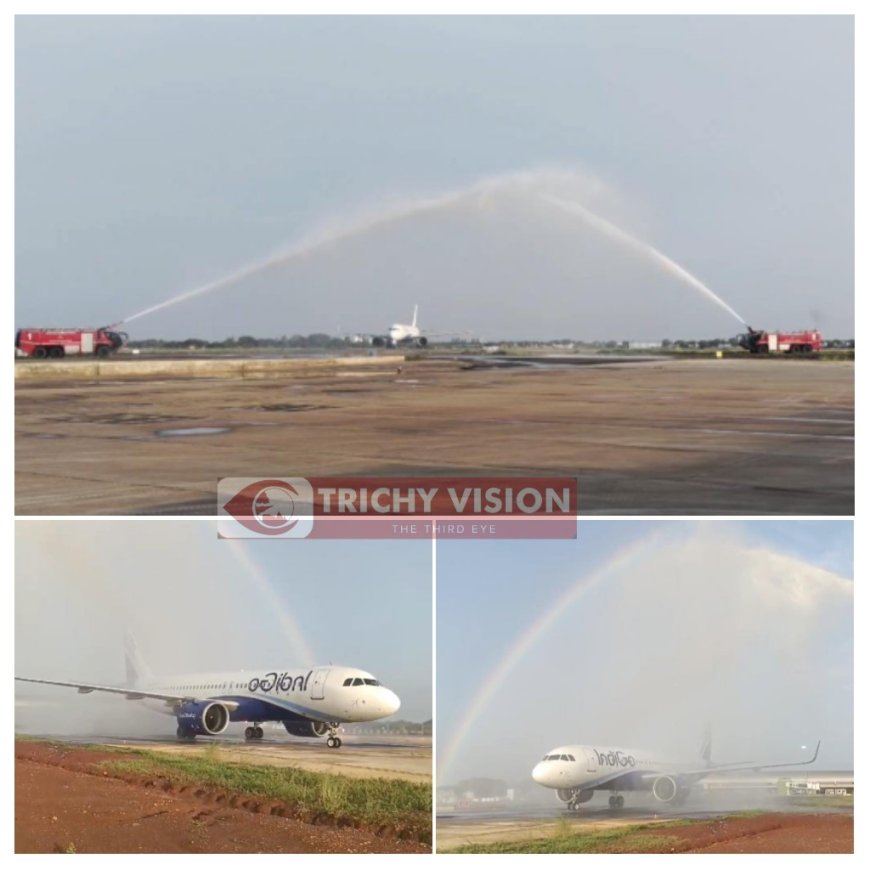 அந்த விமானத்திற்கு விமான நிலைய பாரம்பரிய முறைப்படி வாட்டர் சல்யூட் அடித்து வரவேற்றனர். இந்த விமானம் அபுதாபி – திருச்சி மார்க்கத்தில் வாரத்தில் 4 நாட்கள் இயக்கப்படும் என இண்டிகோ நிறுவனம் தெரிவித்துள்ளது.