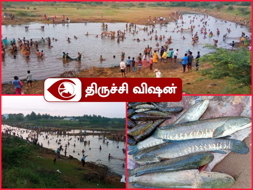 திருச்சி மாவட்டம் மணப்பாறை அருகே பொய்கைப்பட்டி ஊராட்சி கல்பாளையத்தான்பட்டியில் கிராமத்தில் சுமார் 40 ஏக்கர் பரப்பளவில் அமைந்துள்ள அணைக்குளத்தில் வியாழக்கிழமை விடியற்காலை 6 மணிக்கு மீன் பிடித்திருவிழா நடைபெற்றது.