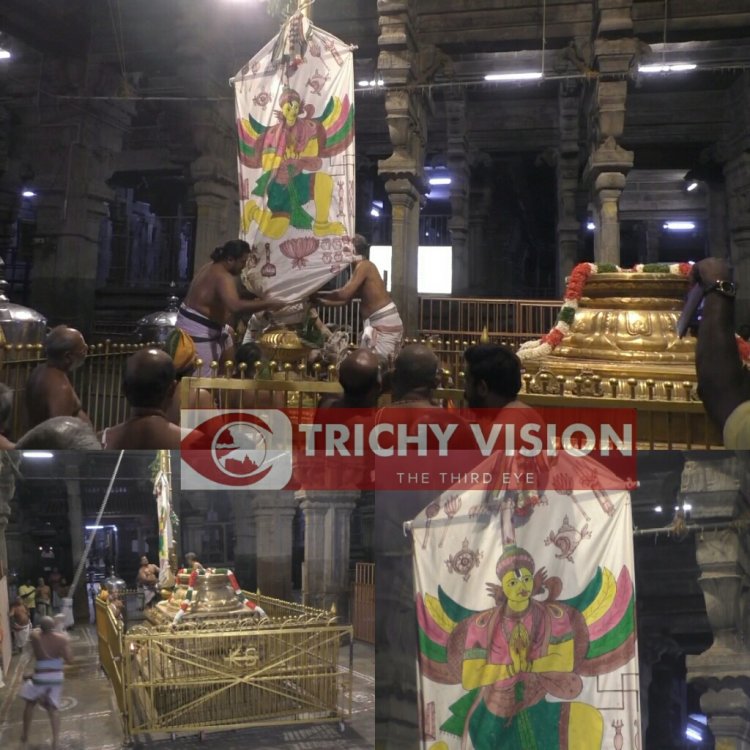 பின்னர் கொடி படத்திற்கு பட்டர் சுவாமிகள் மற்றும் அர்ச்சகர்கள் பூஜைகள் செய்யப்பட்டு சரியாக 5.05 மணிக்கு மேளதாளம் முழங்க கொடியேற்றம் நடைபெற்றது. அப்போது அங்கு இருந்த பக்தர்கள் ரெங்கா ரெங்கா என பக்தி பரவசத்துடன் வணங்கி வழிபட்டனர்.