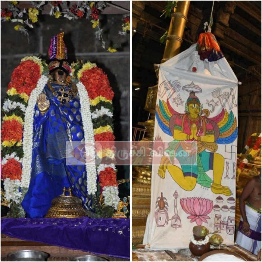 இதற்காக உற்சவர் நம்பெருமாள் சிறப்பு அலங்காரத்தில் மூலஸ்தானத்தில் இருந்து அதிகாலை 3.00 மணிக்கு புறப்பட்டு கொடியேற்ற மண்டபத்தில் எழுந்தருளி பக்தர்களுக்கு காட்சியளித்தார். பின்னர் கொடி படத்திற்கு பட்டாச்சாரியார்களால் மற்றும் அர்ச்சகர்களால் சிறப்பு பூஜைகள் செய்யப்பட்டு மேளதாளம் முழங்க கொடியேற்றம் செய்யப்பட்டது.