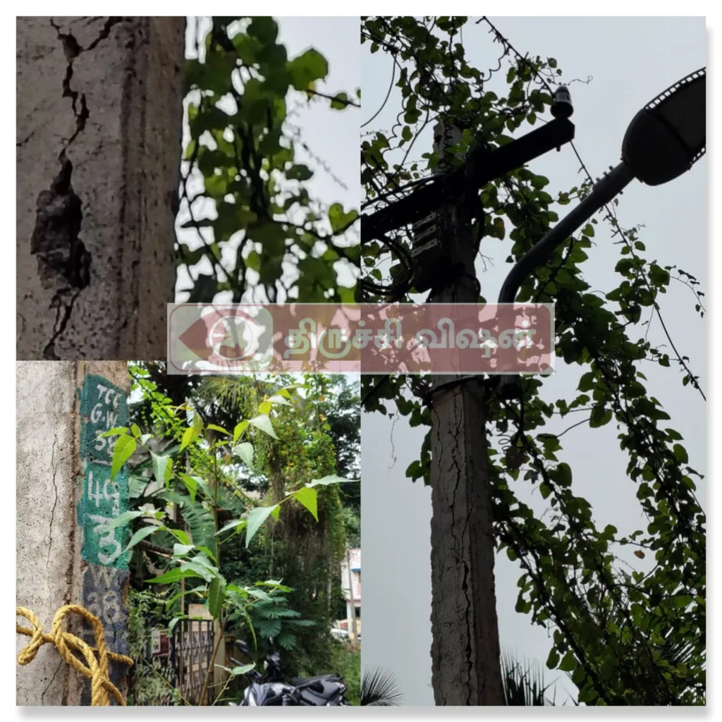 திருச்சி கே.கே.நகர் பூங்கா பின்புறம், மலதி மஹால் எதிரே உள்ள பகுதியில் மின்கம்பங்கள் முழுவதுமாக கொடிகள் மற்றும் செடிகள் சுற்றி வளர்ந்து, ஆபத்தான நிலையில் காணப்படுவது பரிதாபத்தை ஏற்படுத்துகிறது.