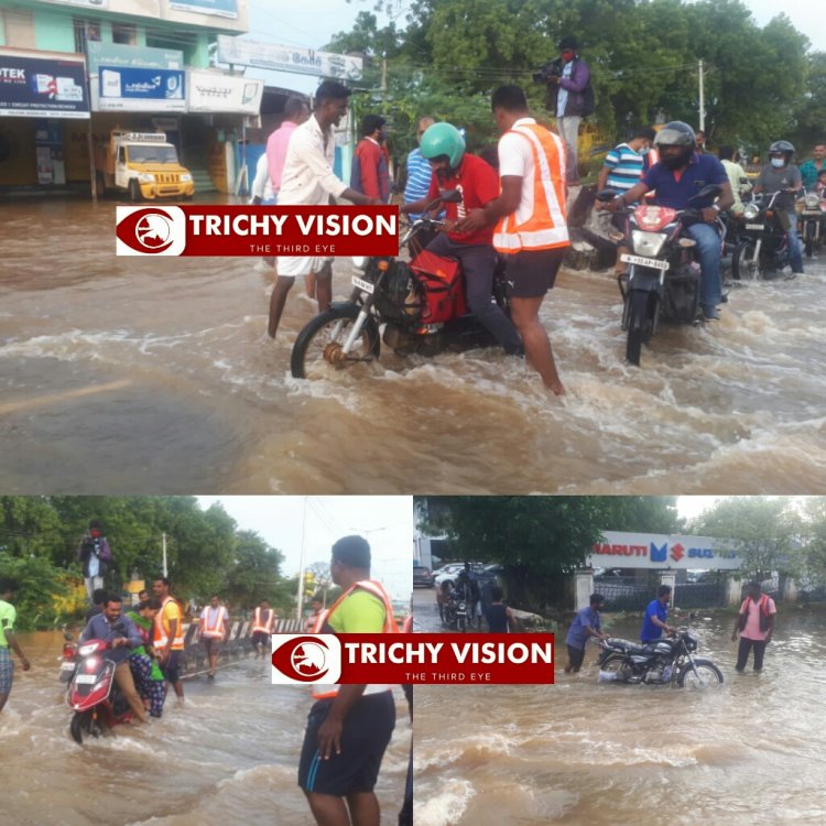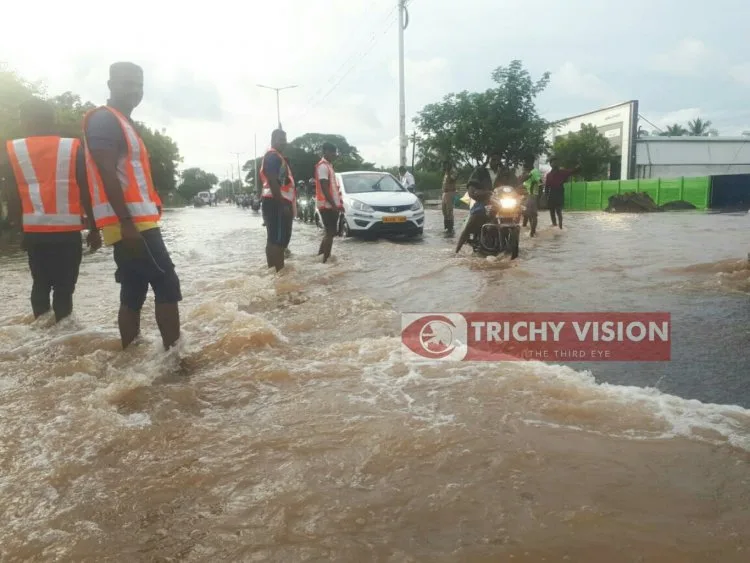 அதனை தொடர்ந்து ஒருவழிப் பாதையாக மாற்றப்பட்டு திருச்சியிலிருந்து மணப்பாறை, திண்டுக்கல் செல்லும் பேருந்துகள் மற்றும் கனரக வாகனங்கள் இயக்கப்பட்டு வருகின்றன. மேலும் இருசக்கர வாகனங்களில் வருபவர்கள் தீரன் நகர் பிராட்டியூர் பகுதிகளை சாலையை கடக்க மிகவும் சிரமப்பட்டு வருகின்றனர். தண்ணீரின் வேகம் அதிகமாக இருப்பதால் சாலையில் வரும் வாகன ஓட்டிகள் தடுமாறி கீழே விழுவதும் வாகனங்கள் பழுது ஏற்படுவதும் சூழ்நிலை உருவாகியுள்ளது.