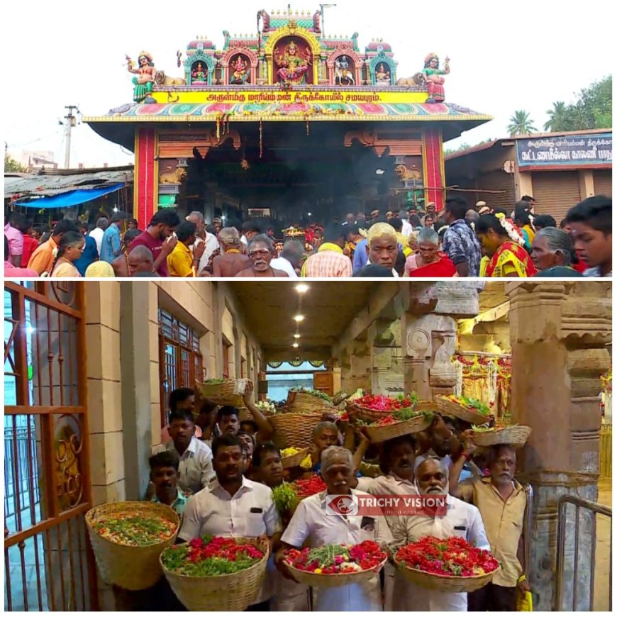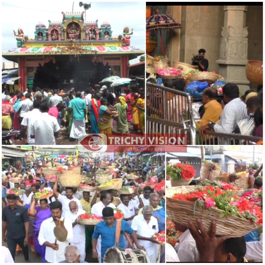 அதன்படி இந்த ஆண்டுகான பூச்சொ ரிதல் விழா இன்று தொடங்கியது. இன்று அதிகாலையில் விக்னேஸ்வர பூஜை ,புண்ணியாகவாசனம், வாஸ்துசாந்தி, அங்குரார்ப்பணம் உள்ளிட்ட பூஜைகள் நடைபெற்றது. காலை 7:30 மணிக்கு மேல் 8:30 மணிக்குள் மீன லக்னத்தில் அம்மனுக்கு காப்பு கட்டுதலுடன் பூச்சொரிதல் விழா தொடங்கியது. இந்நிலையில் பூச்சொரிதல் விழாவை முன்னிட்டு சமயபுரம் கோயில் நிர்வாகம் சார்பில் கோயில் இணை ஆணையர் கல்யாணி தலைமையில் பக்தர்கள், கோயில் பணியாளர்கள் பூக்களை, தட்டுகளிலும், கூடைகளிலும் சுமந்து கொண்டு தேரோடும் வீதிகளில் வலம் வந்து அம்மனுக்கு பூக்களை சாத்தினர்.
