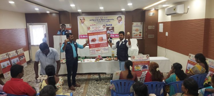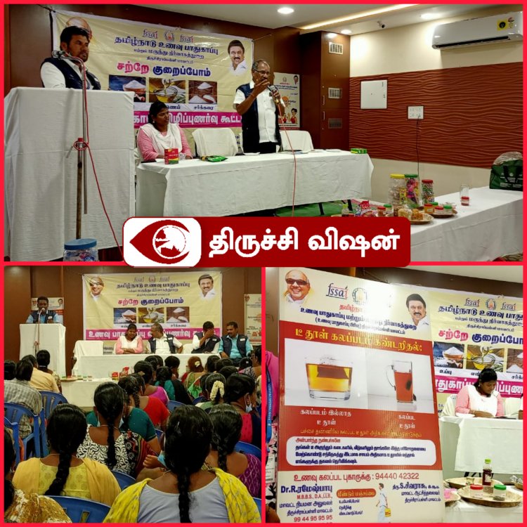 தமிழக முதலமைச்சர் சட்டமன்றத்தில் அறிவிப்பின்படி சற்றே குறைப்போம் திட்டம் மற்றும் உணவு பாதுகாப்பு பதிவு/உரிமம் சிறப்பு முகாம் திருச்சிராப்பள்ளி மாநகராட்சி பகுதியில் ஹோட்டல் அஜந்தாவில் மகளிர் சுய உதவி குழுக்களுக்கு 07.04.2022 வியாழக்கிழமை அன்று நடைபெற்றது.இந்த கூட்டத்தில் சற்றே குறைந்த சர்க்கரை, குறைந்த உப்பு, குறைந்த கொழுப்பு குறைந்த அளவில் உண்ண வேண்டும் என்று அறிவுறுத்தப்பட்டது.