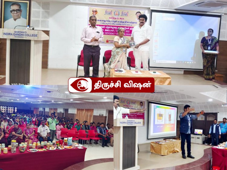 திருச்சிராப்பள்ளி மாவட்டம் உணவு பாதுகாப்பு துறையின் சார்பாக உலக அயோடின் பற்றாக்குறை குறைபாடுகள் தடுப்பு தினம் (Global lodine Deficiency Disorders prevention Day) குறித்து விழிப்புணர்வு கூட்டம் ஸ்ரீமதி இந்திராகாந்தி கல்லூரியில், மாவட்ட நியமன அலுவலர் டாக்டர்.R.ரமேஷ்பாபு, தலைமையில் நேற்று நடைபெற்றது.
