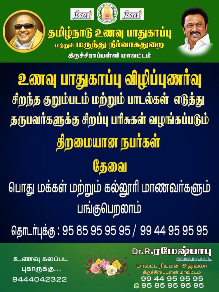 உணவு பாதுகாப்பு குறித்த விழிப்புணர்வை ஏற்படுத்தும் குறும்படங்கள் மற்றும் பாடல்களை சமர்ப்பிக்க பொதுமக்கள் மற்றும் மாணவர்களுக்கு உணவு பாதுகாப்பு மற்றும் மருந்து நிர்வாகத்துறை அழைப்பு விடுத்துள்ளது. போட்டியில் சமர்ப்பிக்கப்பட்ட படைப்புகள் நடுவர் குழுவால் மதிப்பாய்வு செய்யப்படும் சிறந்த படைப்புகளுக்கு ரொக்கப் பரிசுகள் வழங்கப்படும்.