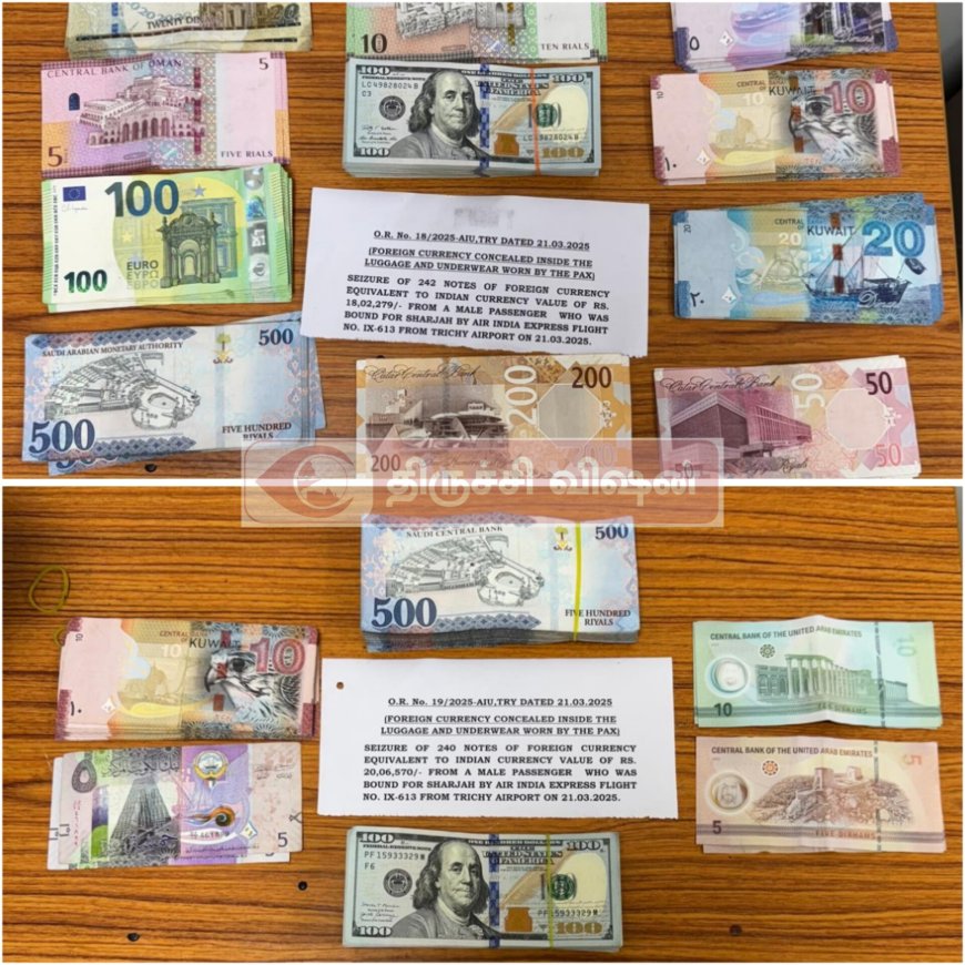 திருச்சி விமான நிலையத்தில் வான் நுண்ணறிவு பிரிவு சுங்கத்துறையினர் வருவாய் புலனாய்வு துறையினர் இருவரும் நடத்திய அதிரடி சோதனையில் இரண்டு ஆண் பயணிகள் சார்ஜாவிற்க்கு யார் இந்தியா விமான மூலம் பயணம் செல்ல இருந்தனர் அவர்களிடமிருந்து 38 லட்சத்தி 849 ரூபாய் மதிப்புள்ள வெளிநாட்டு கரன்சிகள் பறிமுதல் செய்யப்பட்டுள்ளது.