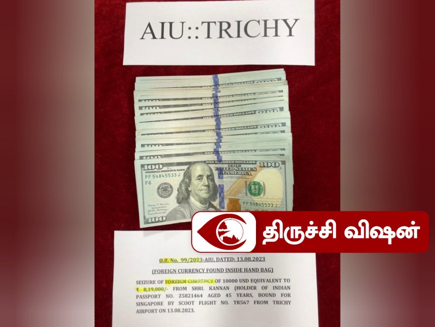 திருச்சியில் இருந்து சிங்கப்பூர் செல்ல இருந்த கண்ணன் என்ற பயணியிடம் வான் நுண்ணறிவு பிரிவு சுங்கத்துறை அதிகாரிகள் சோதனை நடத்தினர். அப்பொழுது அவரிடம் இருந்து பத்தாயிரம் அமெரிக்க டாலர்கள் பறிமுதல் செய்யப்பட்டது.