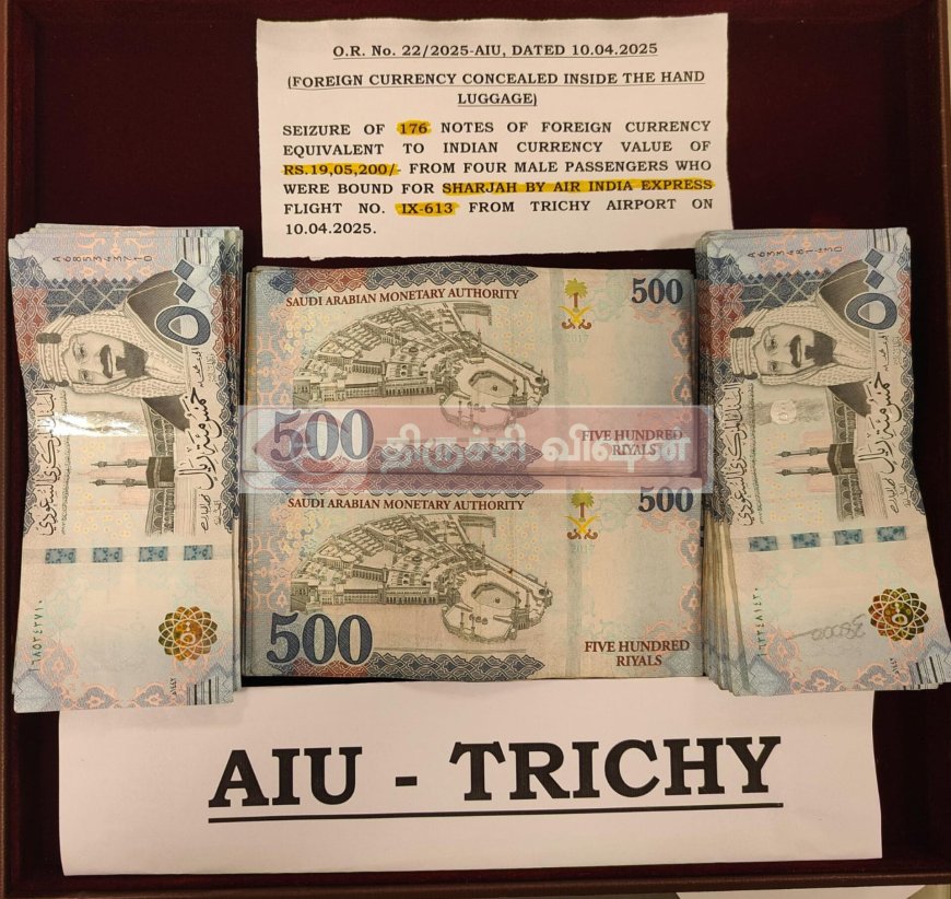 விமானம் மூலம் சார்ஜாவுக்கு பயணம் செய்த நான்கு பயணிகளிடமிருந்து வெளிநாட்டு கரன்சி (சவுதி அரேபிய ரியால்) இந்திய மதிப்பில் 19,05,200 பறிமுதல் செய்யப்பட்டது.
