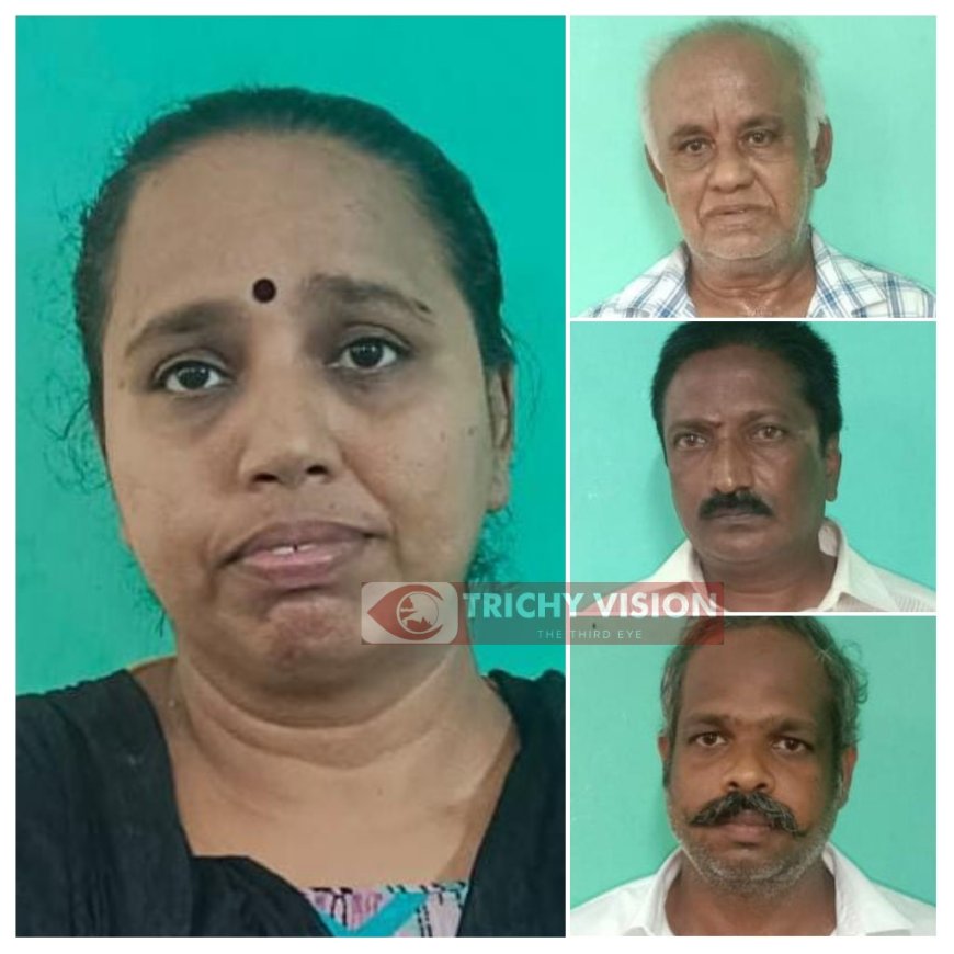 இதன் அடிப்படையில் நவல்பட்டு காவல்நிலைய ஆய்வாளர் நிக்சன் வழக்கு பதிவு செய்து திருச்சி மாவட்டம் நொச்சியம் அருகே உள்ள நெற்குப்பை சேர்ந்த ஜெகநாதன் (76), பூலாங்குடி காலணியை சேர்ந்த முருகானந்தம் மனைவி சாந்தி (43), திருச்சி பீமநகர் நியூ ராஜா காலனியை சேர்ந்த வழக்கறிஞர் காமராஜ் (42), பீமநகர் கிருஷ்ணன் கோவில் தெருவை சேர்ந்த வழக்கறிஞர் கிருஷ்ணகுமார் (48) ஆகியோர் கைது செய்து காவல் நிலையத்தில் வைத்து விசாரணை நடைபெற்றது.