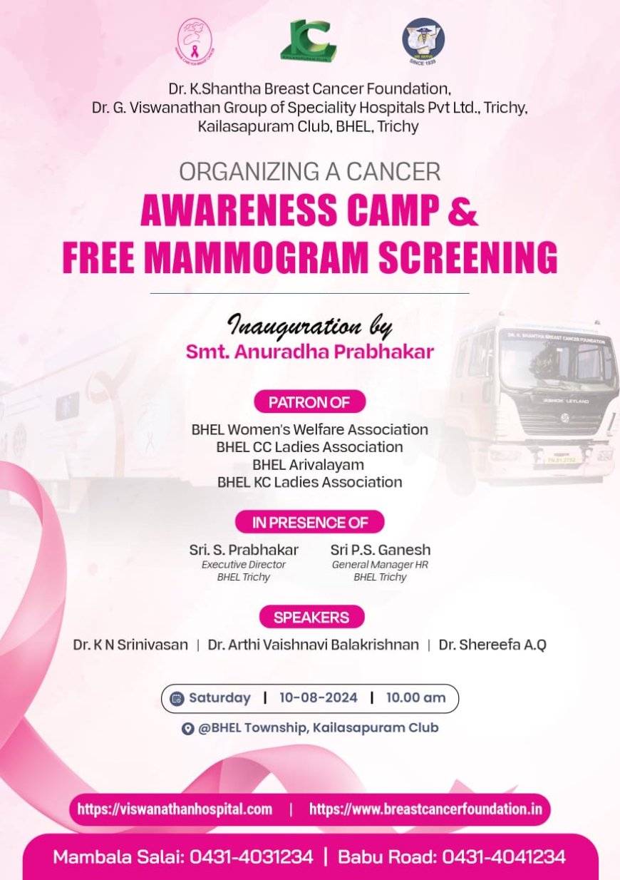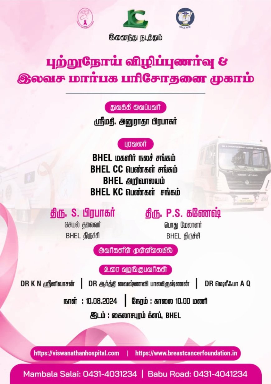 டாக்டர். கே.சாந்தா மார்பக புற்றுநோய் அறக்கட்டளை, டாக்டர். ஜி. விஸ்வநாதன் குரூப் ஆஃப் ஸ்பெஷாலிட்டி ஹாஸ்பிடல்ஸ் பிரைவேட் லிமிடெட், கைலாசபுரம் கிளப், பிஎச்இஎல் இணைந்து புற்றுநோய் விழிப்புணர்வு & இலவச மார்பக பரிசோதனை முகாம்