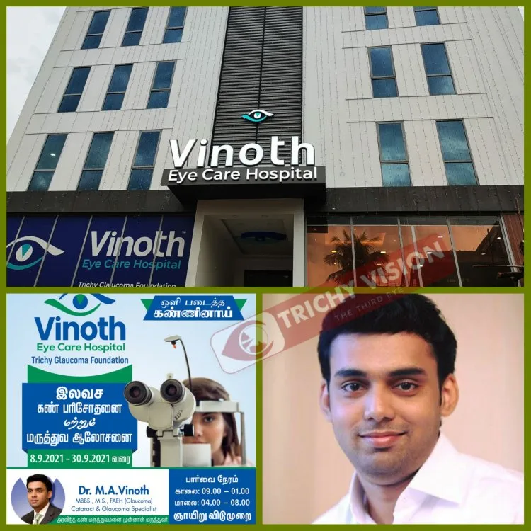 திருச்சி தில்லை நகரில் செயல்பட்டு வரும் வினோத் ஐகேர் மருத்துவமனை மற்றும் திருச்சி கிளக்கோமா அறக்கட்டளை இணைந்து இலவச கண் சிகிச்சை மற்றும் மருத்துவ ஆலோசனையை ஏற்பாடு செய்துள்ளனர்.