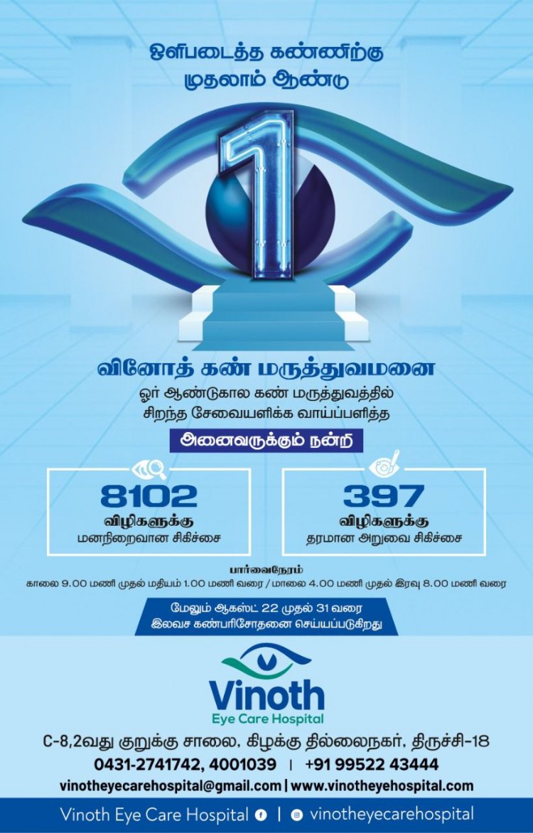 மேலும் இம்மருத்துவமனையில் ஒரு வருடத்தில் 8102 விழிகள் சிகிச்சையும், 397 கண்களுக்கு அறுவை சிகிச்சை செய்யப்பட்டுள்ளது. இதனை தொடர்ந்து வினோத் கண் மருத்துவமனையில் நாளை (22.08.2022) முதல் (31.08.2022) ஆம் தேதி வரை இலவச கண் பரிசோதனை செய்யப்படுகிறது.