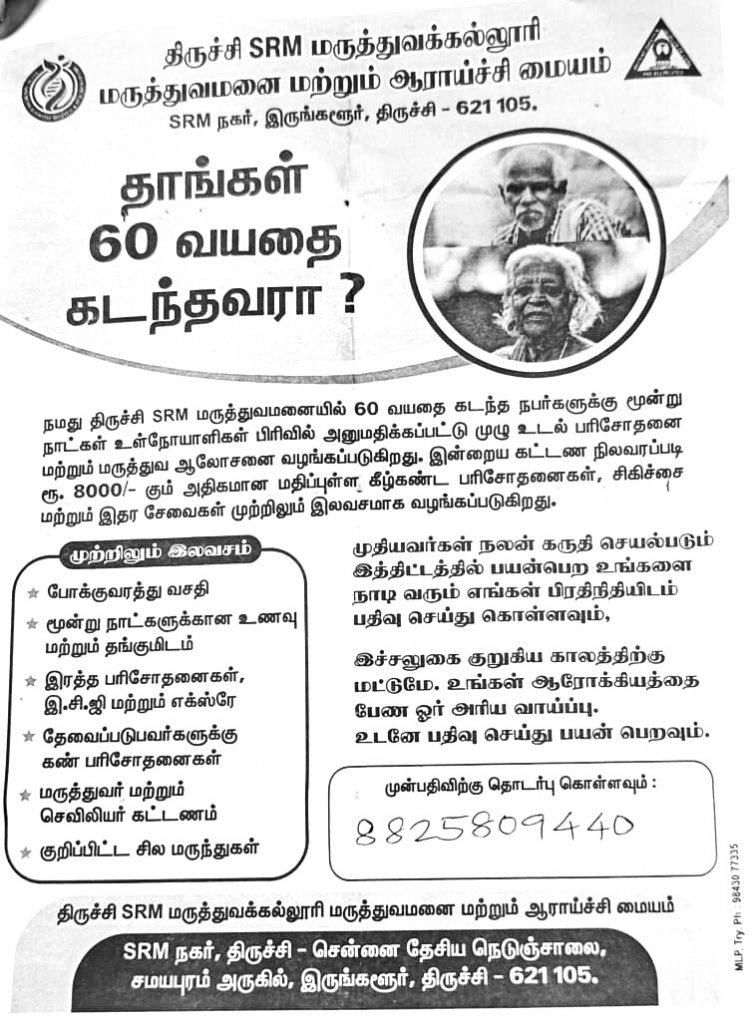 60 வயது கடந்த நபர்களுக்கு திருச்சி எஸ்.ஆர்.எம் மருத்துவ கல்லூரி மருத்துவமனை ஆராய்ச்சி மையத்தில் மூன்று நாட்கள் உள் நோயாளிகள் பிரிவில் அனுமதிக்கப்பட்டு முழு உடல் பரிசோதனை மற்றும் மருத்துவ ஆலோசனை வழங்கப்படுகிறது.