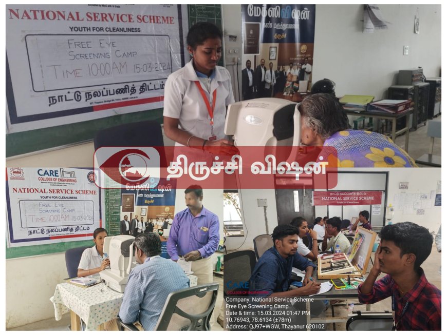 கேர் பொறியியல் கல்லூரியில் நாட்டு நலப்பணி திட்டம் மற்றும் இளைஞர் செஞ்சிலுவை சங்கம் சார்பில் இலவச கண் பரிசோதனை முகாம் நேற்று நடத்தப்பட்டது. கேர் பொறியியல் கல்லூரியின் எலக்ட்ரிக்கல் இன்ஜினியரிங் ஆய்வகத்தில் இலவச கண் பரிசோதனை முகாம் ஏற்பாடு செய்யப்பட்டது.