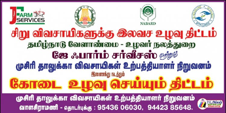 நபார்டு வங்கி உதவியுடன் உழவர் உற்பத்தியாளர் குழு உறுப்பினர்களுக்கு இலவச உழவு திட்டத்தை தொடங்கியுள்ளனர். ஜூன் 13ஆம் தேதி தொடங்கப்பட்ட இந்நிகழ்வுக்கு நபார்டு வங்கி மாவட்ட வளர்ச்சி மேலாளர் நவீன்குமார் தலைமை வகித்து திட்டத்தை தொடங்கி வைத்துள்ளார்.