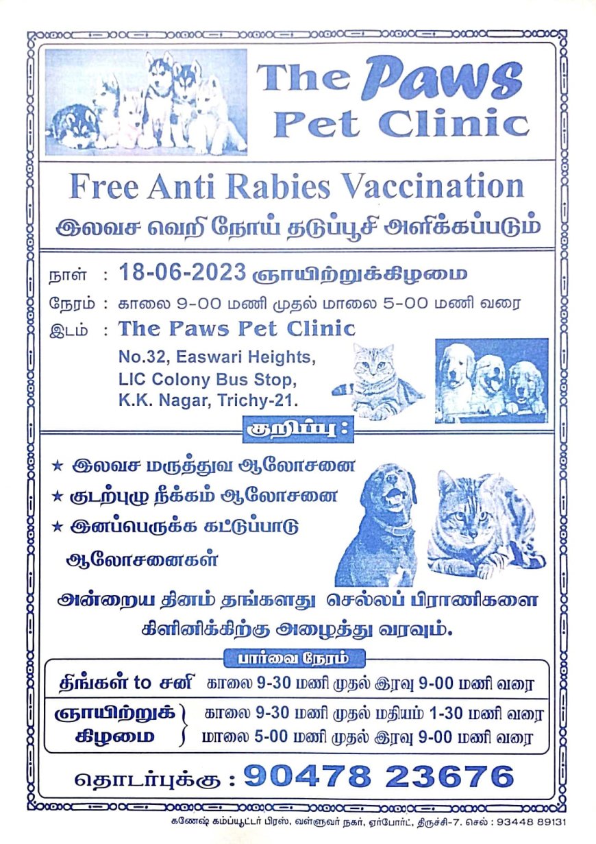 திருச்சி கே கே நகரில் செயல்பட்டு வரும் The Paws Pet Clinic-ல் இலவச வெறி நோய் தடுப்பூசி அளிக்கப்படுகிறது. இன்று (18.06.2023) காலை 9 மணி முதல் மாலை 5 மணி வரை தடுப்பூசி செலுத்திக் கொள்ளலாம்.