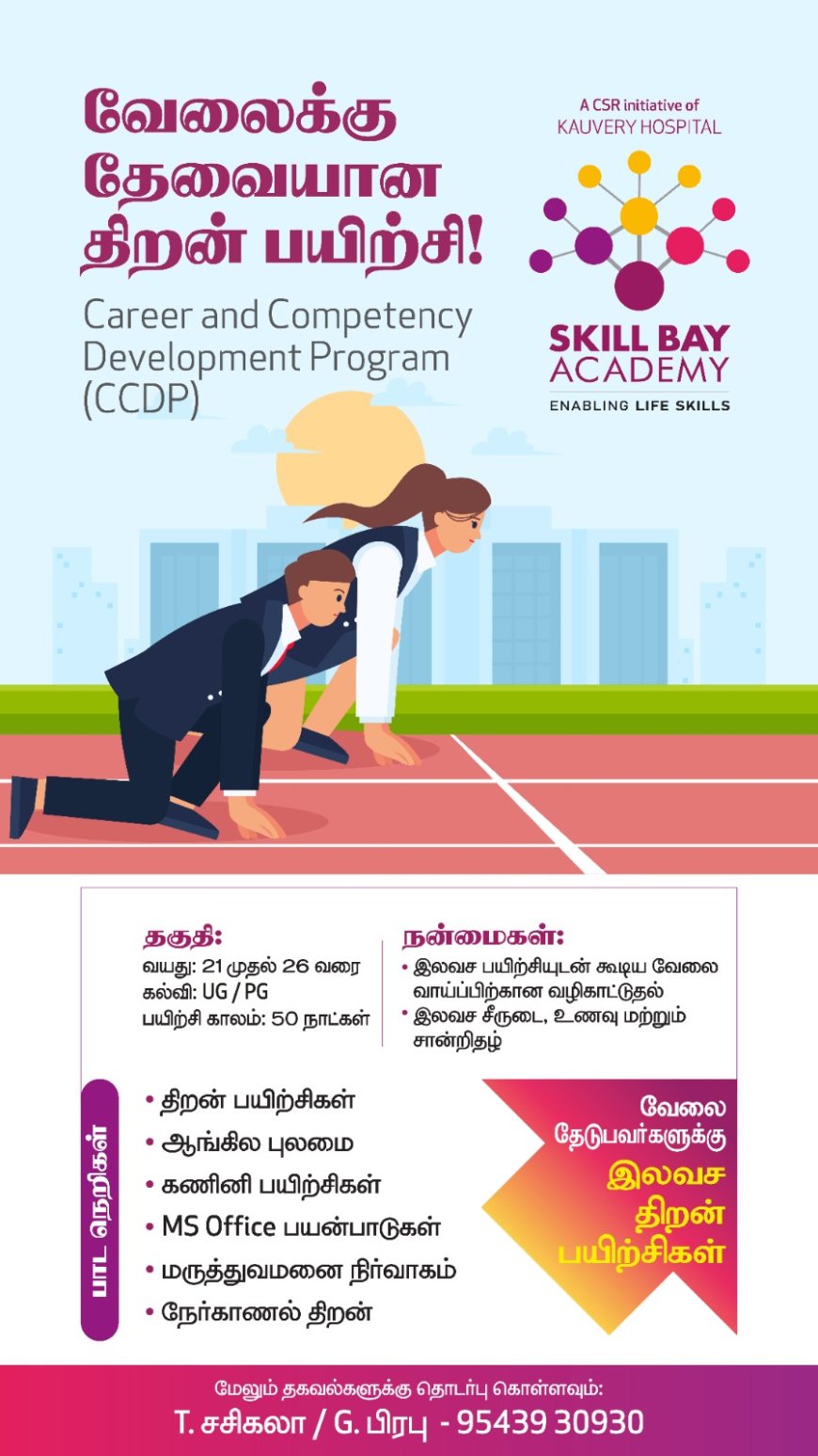 திருச்சி காவேரி மருத்துவமனை skill bay academy (enabling life skills) சார்பில் வேலைக்கு தேவையான திறன் பயிற்சி வகுப்புகள்(career and competency development program) CCDP வேலை தேடும் இளைஞர்களின் திறனை மேம்படுத்துவதற்காக அளிக்கப்பட்டு வருகிறது.