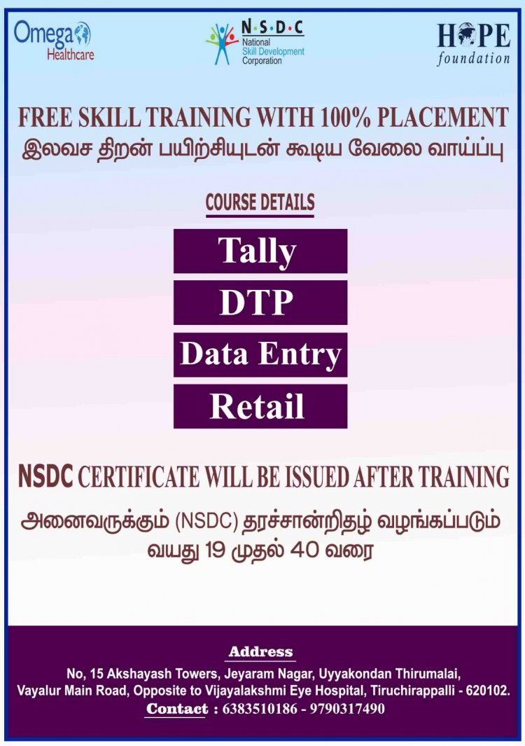 ஒமேகா சென்டர் ஆஃப் ஹோப் எம்ப்ளாய்மென்ட் டிரெய்னிங் இன்ஸ்டிடியூட் சார்பில், இலவச திறன் பயிற்சியுடன் கூடிய வேலைவாய்ப்பு வெறும் 60 மணி நேரம் (ஒரு நாளைக்கு 1.5 மணி  நேரம் மட்டுமே) வழங்கப்பட்டு திருச்சி பகுதியில் உள்ள தனியார் நிறுவனங்களில் வேலை வாங்கி தரப்படும்.