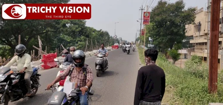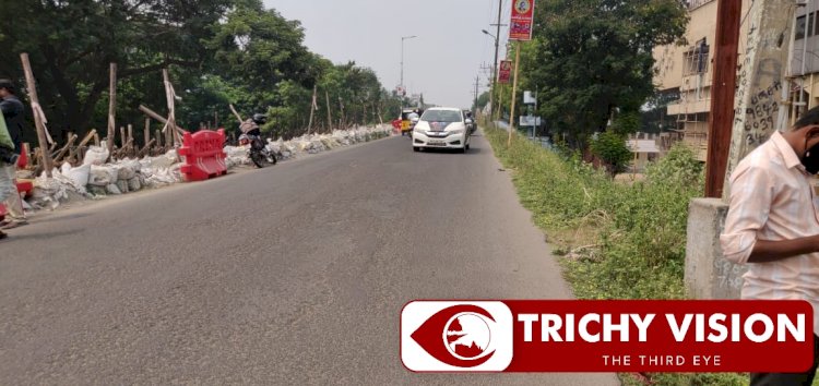 இதற்கிடையில் தான் திருச்சியில் பெய்த மழையின் காரணமாக சாலை ரோட்டிலிருந்து மெயின் கார்ட் கேட் செல்லும் வழியில் உள்ள கோட்டை ரயில்வே மேம்பாலத்தின் ஓரத்தில் மண் சரிந்து அங்கு இருந்த மின்கம்பம் சாய்ந்து விழுந்தது. ஊரடங்கு காரணமாக பொதுமக்கள் அப்பகுதியில் செல்லாததால் பெரிய சேதம் தவிர்க்கப்பட்டது. அன்றுமுதல் சரிந்த சாலையில் மணல் மூட்டைகளை அடிக்கி கனரக வாகனங்களுக்கு தடை விதித்து கம்பிகளை குறுக்கே வைத்தனர்.