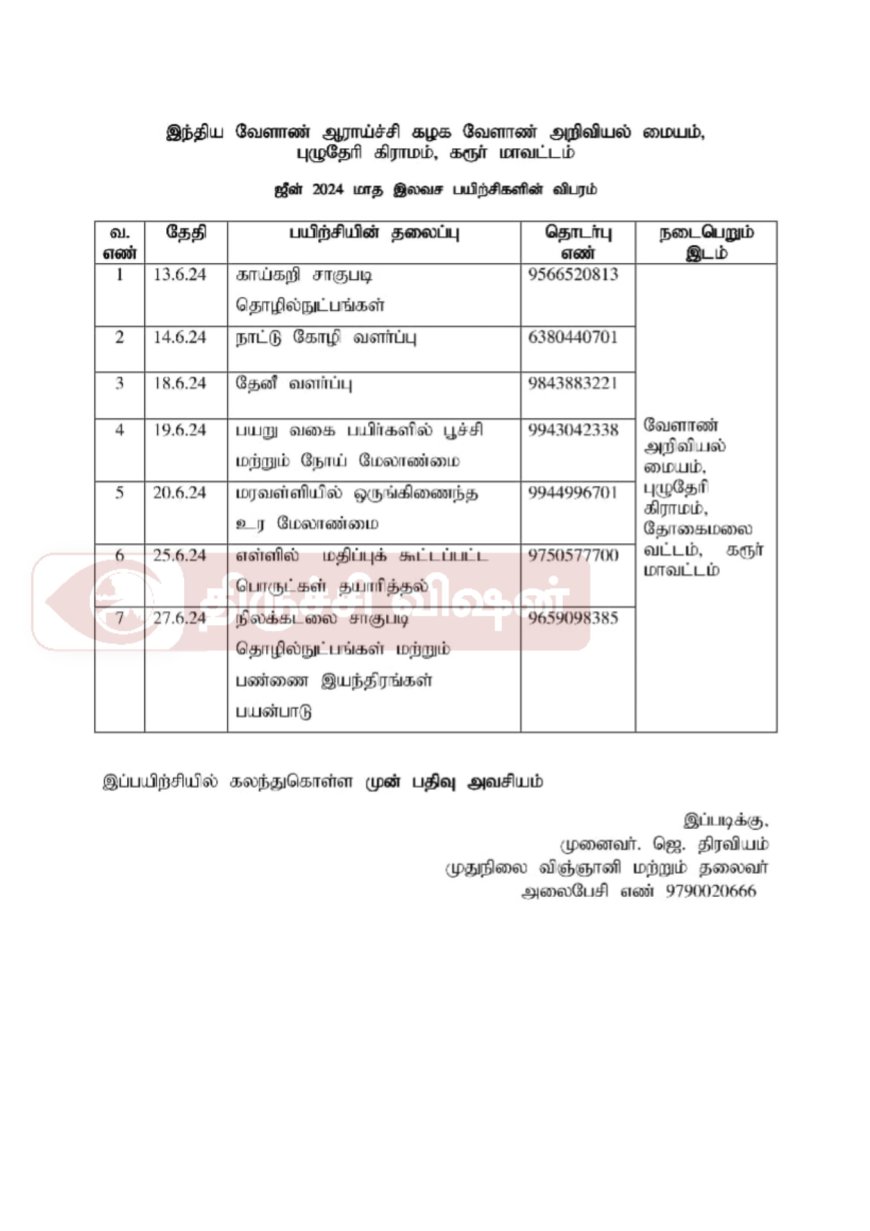இந்திய வேளாண் ஆராய்ச்சி கழக வேளாண் அறிவியல் மையம் புழுதேறி கிராமம் கரூர் மாவட்டத்தில் ஜூன் மாதம் நடைபெற உள்ள இலவச பயிற்சி வகுப்புகளுக்கான விபரம்.