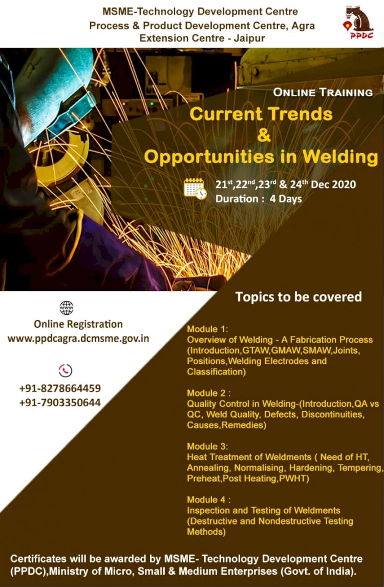 2020-21 ஆண்டிற்கான மத்திய அரசின் PMKVY 3.0 ( பிரதான் மந்திரி கவுஷல் விகாஸ் யோஜனா) திட்டத்தின் கீழ் வேலைவாய்ப்பற்ற இளைஞர்களுக்கு இலவச “வெல்டிங்” குறுகியகால நேரடி பயிற்சி வகுப்புகள் விரைவில் தொடங்கப்பட உள்ளது.