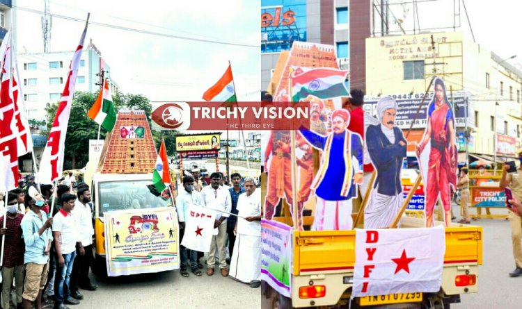 திருச்சியில் இந்திய ஜனநாயக வாலிபர் சங்கத்தின் சார்பில் விடுதலைப் போராட்ட வீரர்களின் பட முககவசம் அணிந்தும், விடுதலைப் போராட்ட வீரர்களை தாங்கிய அலங்கார வாகன ஊர்வலம் திருச்சி மத்திய பேருந்து நிலையத்தில் இருந்து பெரியார் சிலையில் துவங்கி சத்திரம் பேருந்து நிலையம் வரை ஊர்வலம் நடத்த இருந்தனர்.