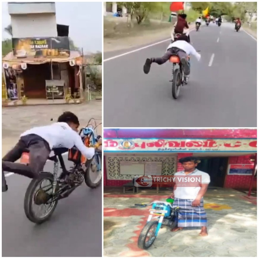 திருச்சிராப்பள்ளி மாவட்டம். புலிவலம் காவல் நிலைய எல்லை, புலிவலம் அருகே, துறையூர் திருச்சி சாலையில், (23.05.24) அன்று முசிறி தலுக்கா புலிவலம் மெயின் ரோட்டைச் சேர்ந்த சிங்காரம் மகன் நிவாஷ் (19) என்பவர் மனித உயிருக்கு ஆபத்தை ஏற்படுத்தும் வகையில் மோட்டார் சைக்கிளில் படுத்துக்கொண்டு சாகசம் செய்து, அலட்சியமாக ஓட்டிச் சென்றார். இந்த வீடியோ கட்சி சமூக வலைத்தளங்களில் வைரலாகி வந்தது.