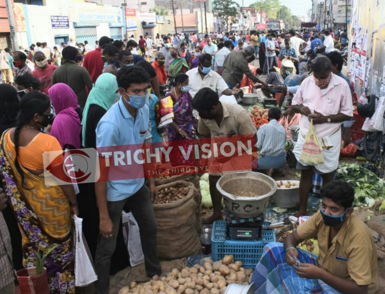 நேற்று காலை விற்பனை செய்யப்பட்ட காய்கறிகளின் விலையை காட்டிலும், இன்று மூன்று மடங்கு விலை உயர்வாக விற்பனை செய்யப்பட்டு வருகிறது. இது ஒரு செயற்கை விலை ஏற்றம் என பொதுமக்கள் குற்றம் சாட்டுகின்றனர். காந்தி மார்க்கெட்டை சுற்றிலும் உள்ள காய்கறி கடைகளிலும், திருச்சி மேலப்புலியூர் ரோட்டில் தற்காலிகமாக உருவாக்கப்பட்டுள்ள காய்கறி சந்தையிலும் 5 ஆயிரத்துக்கும் மேற்பட்ட பொதுமக்கள், காய்கறிகளை வாங்க அதிகாலை முதல் குவிய தொடங்கினர்.
