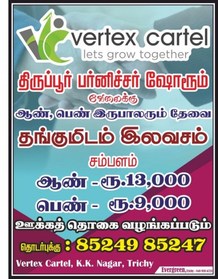 திருப்பூரில் உள்ள பர்னிச்சர் ஷோரூமில் பணிபுரிய வேலைக்கு ஆட்கள் தேவைப்படுகிறார்கள்.