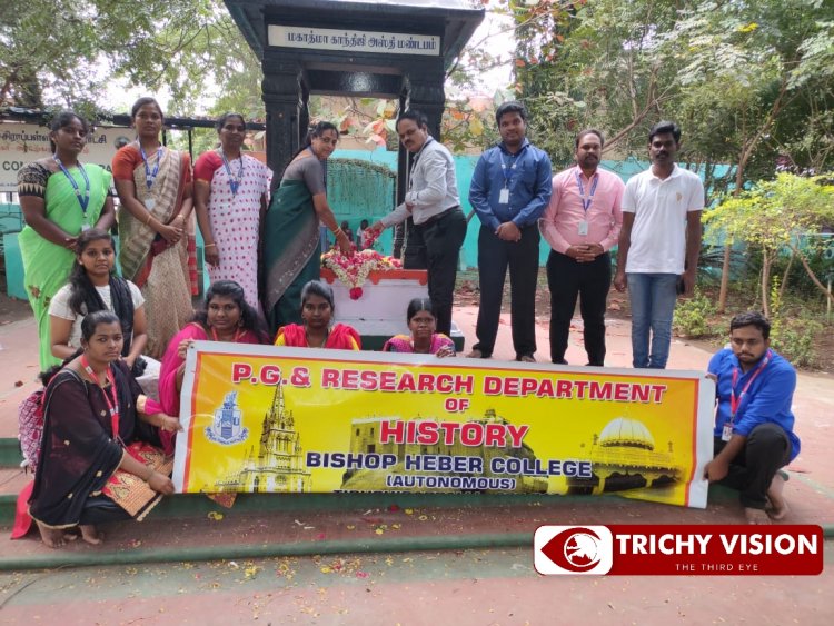 காந்தியடிகள் நினைவு தினத்தை முன்னிட்டு புத்தூர் அரசு மருத்துவமனை அருகிலுள்ள காந்தியடிகள் அஸ்தி மண்டபத்தில் திருச்சி பிஷப் ஹீபர் கல்லூரியின் வரலாற்றுத் துறை பேராசிரியர்களும் மாணவ மாணவியர்களும் சென்று நினைவஞ்சலி செலுத்தி வந்தனர்.