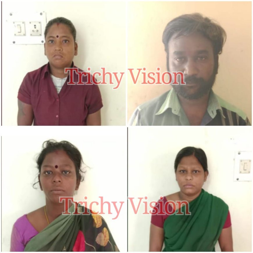 விசாரணையில் திருச்சி வடக்கு தாராநல்லூர் காமராஜ் நகரை சேர்ந்த மணிகண்டன் (34) மற்றும் அதே பகுதியைச் சேர்ந்த சசி (29), கருப்பாயி (34) மற்றும் தமிழரசி (34) என ஒரு ஆண் உட்பட 3 பெண்கள் என 4 பேர் செல்போன் டவரில் இருந்த பேட்டரிகளை திருட முயன்றது தெரிய வந்தது. இதில் பெண்கள் அனைவரும் தூய்மை பணியாளராக பணி புரிந்து வந்துள்ளனர்.