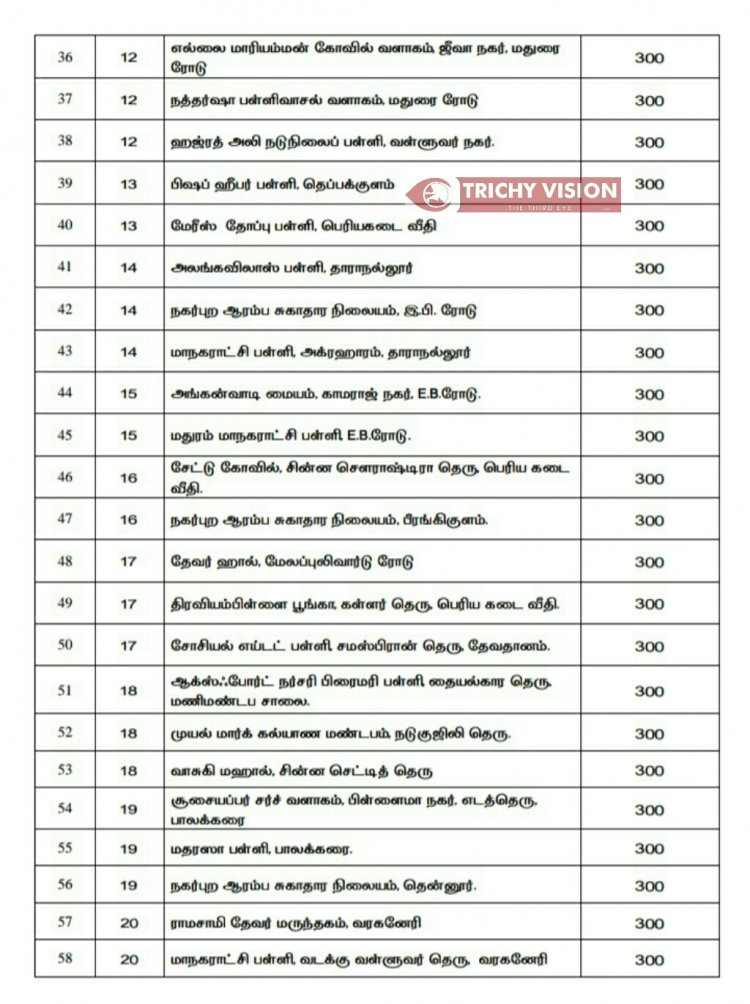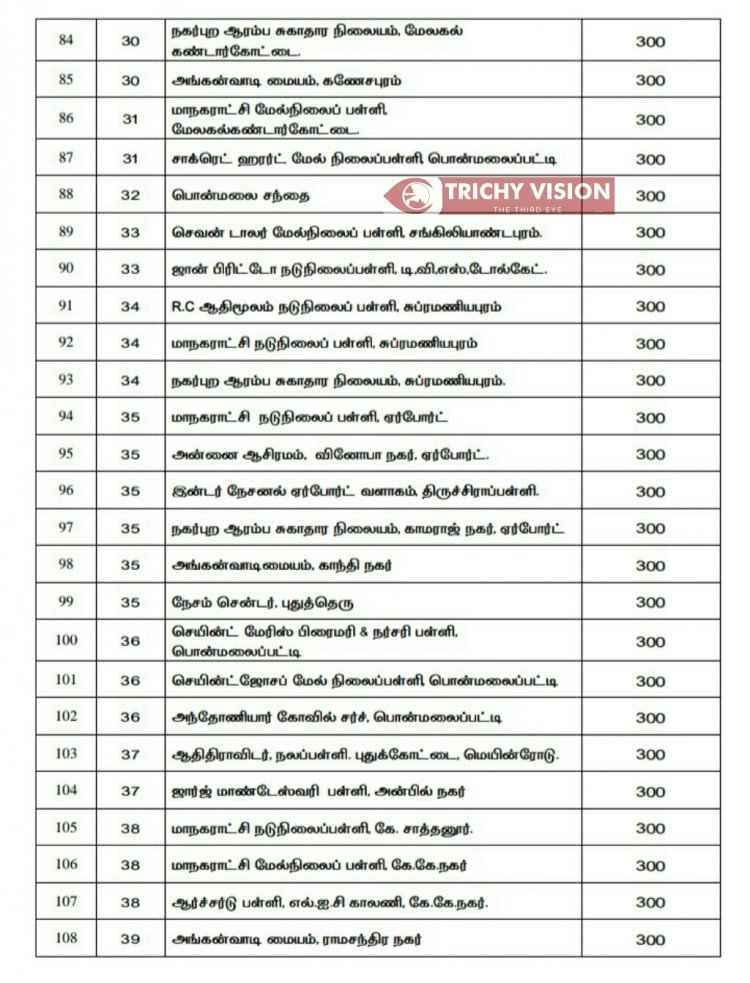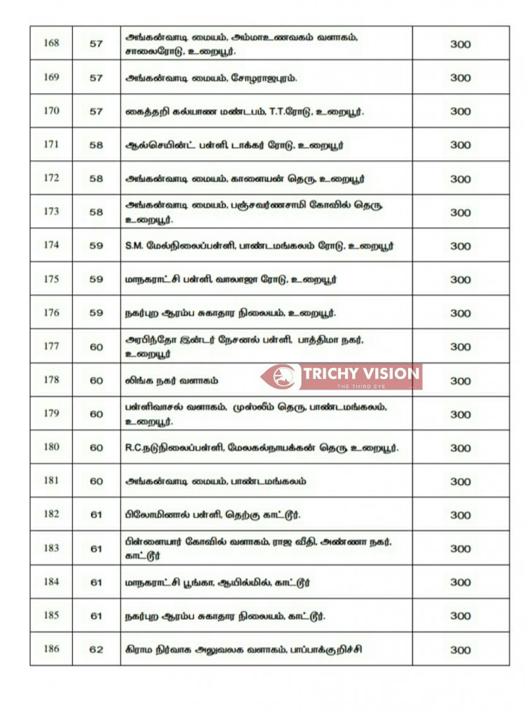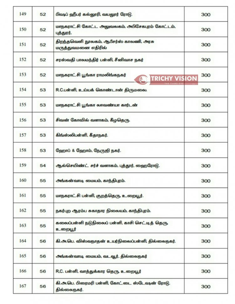 மேற்காணும் பட்டியல் www.trichycorporation.gov.in என்ற மாநகராட்சி இணையதளத்தில் வெளியிடப்பட்டு உள்ளது. எனவே இது நாள் வரை தடுப்பூசி போடாத பொதுமக்கள் அனைவரும் இந்த அரிய வாய்ப்பினை பயன்படுத்தி தடுப்பூசியைப் போட்டுக் கொண்டு கொரோனா நோயிலிருந்து தங்களை தங்கள் குடும்பத்தினர்களையும் மற்றும் சமுதாயத்தையும் பாதுகாத்துக் கொள்ளுமாறு கேட்டுக் கொள்ளப்படுகிறது.