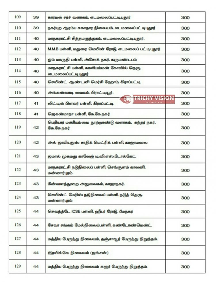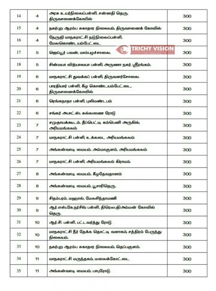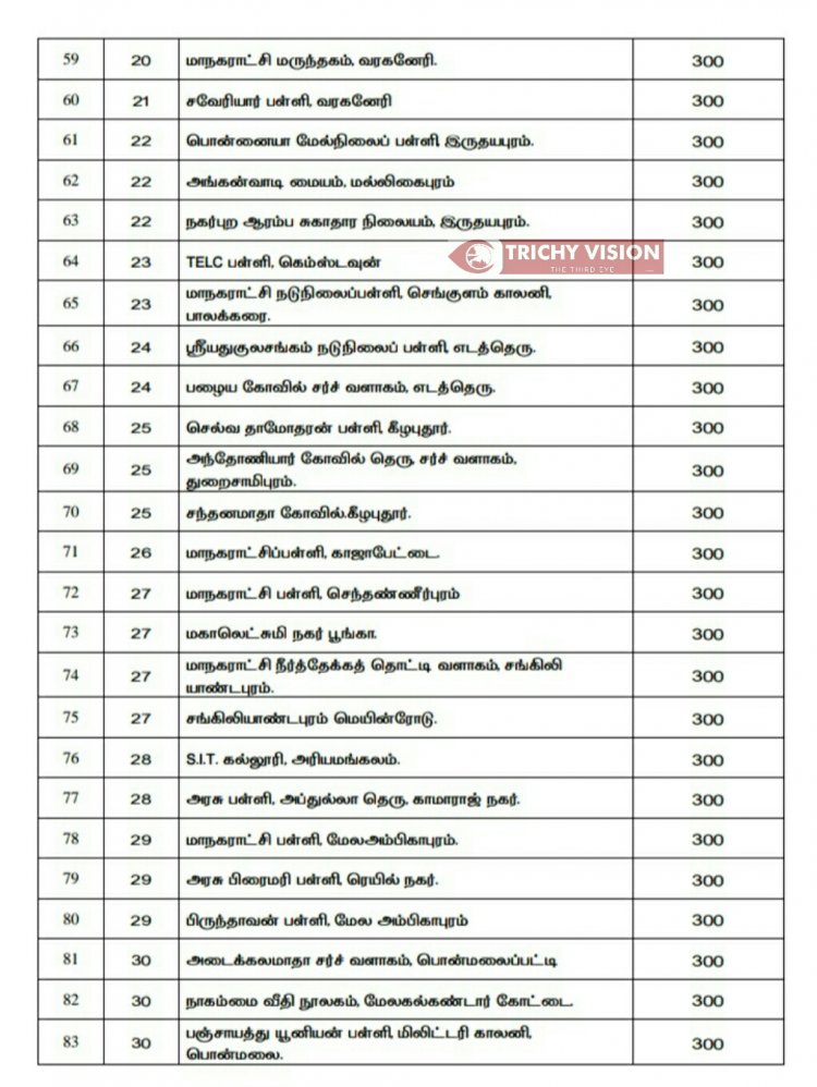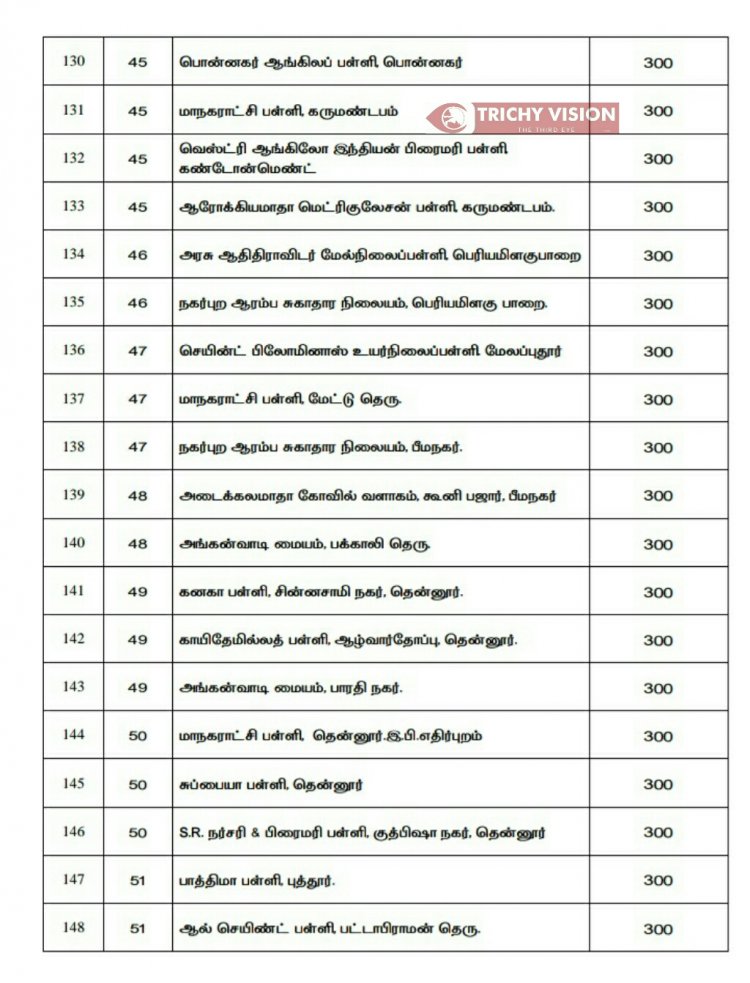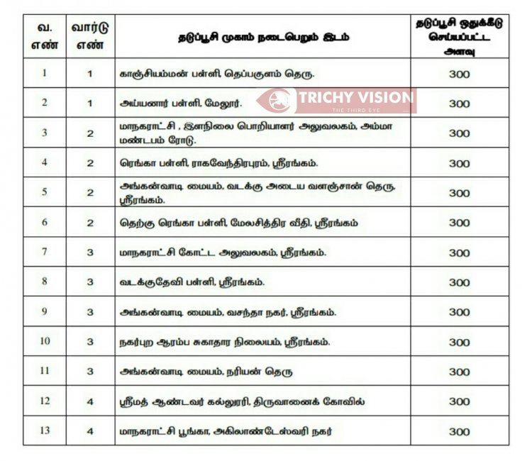 மேற்காணும் பட்டியல் www.trichycorporation.gov.in என்ற மாநகராட்சி இணையதளத்தில் வெளியிடப்பட்டு உள்ளது. எனவே இது நாள் வரை தடுப்பூசி போடாத பொதுமக்கள் அனைவரும் இந்த அரிய வாய்ப்பினை பயன்படுத்தி தடுப்பூசியைப் போட்டுக் கொண்டு கொரோனா நோயிலிருந்து தங்களை தங்கள் குடும்பத்தினர்களையும் மற்றும் சமுதாயத்தையும் பாதுகாத்துக் கொள்ளுமாறு கேட்டுக் கொள்ளப்படுகிறது.