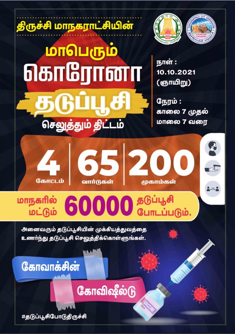 திருச்சி மாநகராட்சியில் கொரோனா வைரஸ் பரவலை தடுக்கும் பொருட்டு 18 வயதுக்கு மேற்பட்ட அனைவருக்கும் நாள் தோறும் சிறப்பு முகாம்கள் நடத்தப்பட்டு கொரோனா தடுப்பு ஊசி செலுத்தப்பட்டு வருகிறது. இந்நிலையில் தமிழகம் எங்கும் நாளை (10.10.2021) மாபெரும் தடுப்பூசி முகாம்கள் நடத்த திட்டமிடப்பட்டுள்ளது.