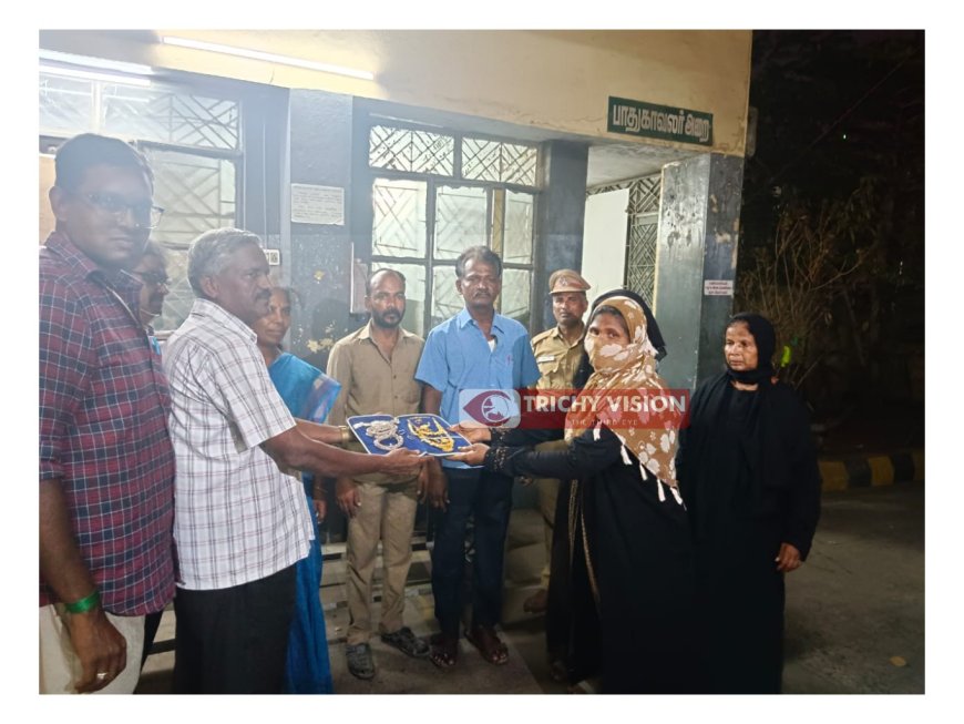 பின்னர் திருச்சிக்கு பேருந்து வந்திருப்பது தெரிய வரவே திருச்சி வந்தடைந்தார். இதனையடுத்து கண்டோன்மென்ட் காவல் நிலையத்தில் மதீனவிடம் சுமார் 5.5 லட்சம் மதிப்புள்ள 82 கிராம் தங்க நகைகள் ஒப்படைக்கப்பட்டது. காணாமல் போன நகை பையை உண்மையுள்ளதோடு எடுத்து அதனை முறையான நபரிடம் சேர்க்க உதவிய ஓட்டுனர் மற்றும் நடத்துனருக்கு காவல்துறையினர் மற்றும் மதினாவின் உறவினர்கள் பாராட்டுகளை தெரிவித்துக் கொண்டனர்.முன்னதாக பேருந்தில் தவறவிட்ட நகைகள் குறித்து கண்டோன்மென்ட் காவல்நிலையத்தில் அரசு போக்குவரத்துக்கழக கண்டோன்மென்ட் கிளை சார்பில் தகவல் தெரிவிக்கப்பட்டது.