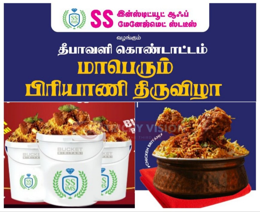 கொஞ்சமாக கிடைத்தாலே மகிழ்ச்சி என்றிருக்கும் நிலையில் அன்லிமிடெட்டாக அதுவும் குறைந்த விலையில் கிடைத்தால் மகிழ்ச்சி இரட்டிபாகும் இல்லையா?? அப்படி திருச்சியில் மாபெரும் பிரியாணி திருவிழாவை நடத்தவிருக்கின்றனர் எஸ்எஸ் இன்ஸ்டிடியூட் ஆப் மேனேஜ்மென்ட் ஸ்டடிஸ், அதனின் இயக்குனர் திருகண்ணன் அவர்கள் திருவிழா பற்றி பகிர்கிறார்.,