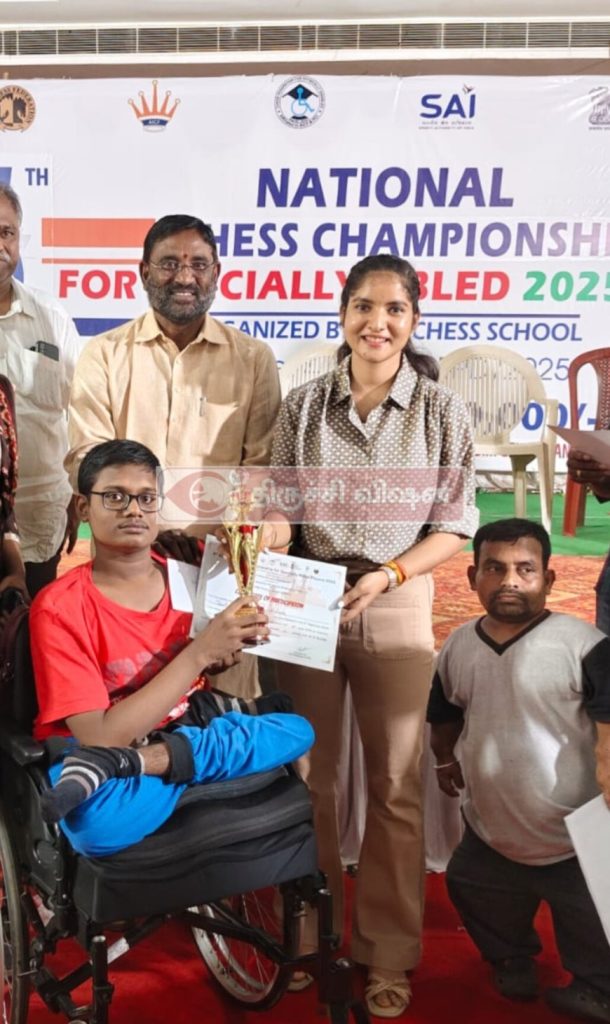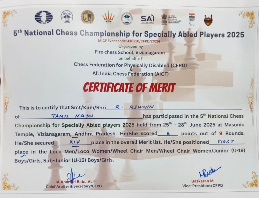 கடந்த ஜூன் மாதம் 25 லிருந்து 28ஆம் தேதி வரை ஆந்திரப்பிரதேச மாநிலத்தில் நடைபெற்ற அகில இந்திய செஸ் போட்டியில் திருச்சி மாவட்டம் காட்டூர் பாப்பாக்குறிச்சி அரசு ஆதிதிராவிடர் நல ஆண்கள் மேல்நிலைப் பள்ளியில் பன்னிரண்டாம் வகுப்பு பயிலும் மாணவர் R.அஸ்வின்