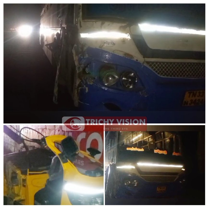 அப்போது எதிர்பாராத விதமாக பேருந்து எதிரில் வந்த ஆட்டோ மீது மோதியது. இதில் ஆட்டோ சாலையில் கவிந்த நிலையில் சில அடி தூரம் இழுத்துச் செல்லப்பட்டு சாலை அருகில் இருந்த தடுப்பு சுவர் மீது மோதியது. இதில் 5 பேரும்ம் படுகாயமடைந்தனர். இதனை கண்ட அக்கம் பக்கத்தினர் 5 பேரையும் மீட்டு திருச்சி அரசு மருத்துவமனைக்கு சிகிச்சைக்காக அனுப்பி வைத்தனர்.