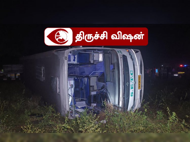 மணப்பாறை அருகே அதிகாலை அரசு சொகுசு பேருந்து நெடுஞ்சாலையில் கவிழ்ந்து விபத்துக்குள்ளனதில் – 10 பேர் காயமடைந்தனர்.