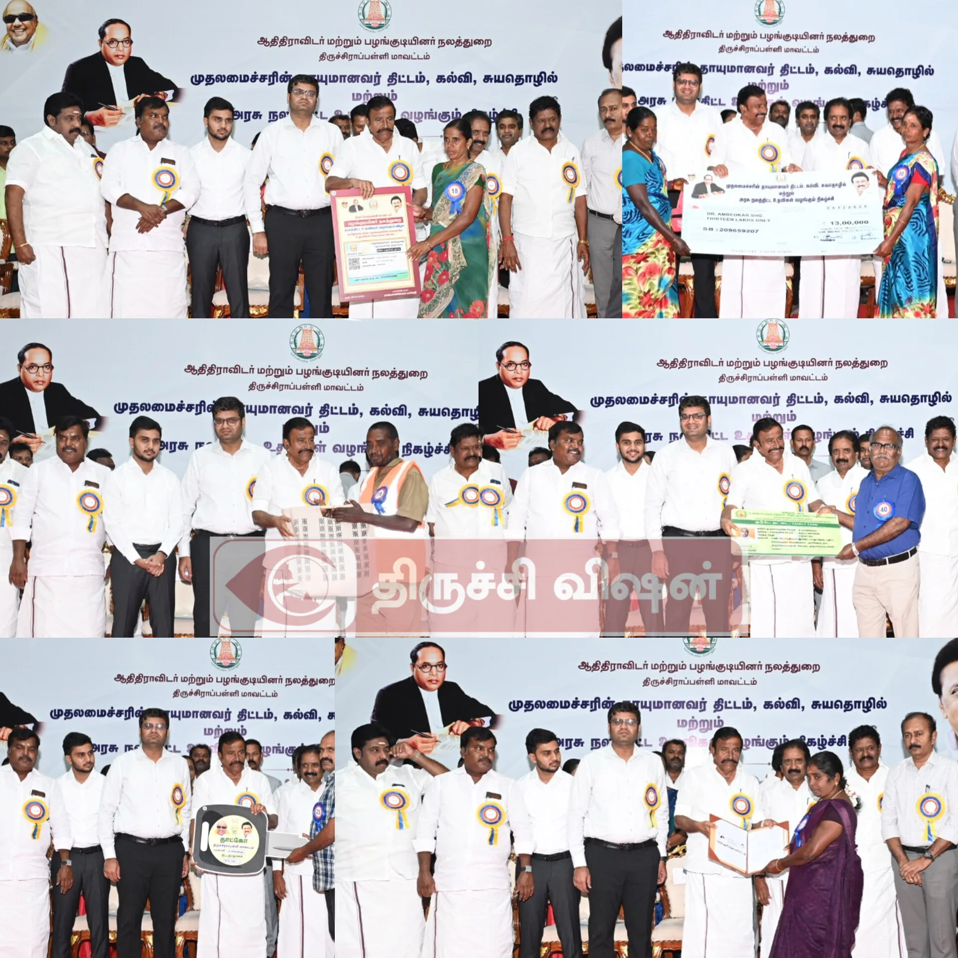 அந்த வகையில் இன்று திருச்சிராப்பள்ளி கலையரங்கத்தில் ஆதிதிராவிடர் மற்றும் பழங்குடியினர் நலத்துறையின் சார்பில் நடைபெற்ற அரசு விழாவில் ஆதிதிராவிடர் நலத்துறையின் சார்பில் 87 பயனாளிகளுக்கு ரூபாய் 26 இலட்சத்து 58 ஆயிரம் மதிப்பீட்டிலும், பழங்குடியினர் நலத்துறையின் சார்பில் 10 பயனாளிகளுக்கு வன உரிமை பட்டா மற்றும் பழங்குடியினர் குடும்ப நல அட்டைகளையும், தாட்கோ சார்பில் 334 பயனாளிகளுக்கு ரூபாய் 281 இலட்சம் மதிப்பீட்டிலும், தமிழ்நாடு மாநில ஊரக வாழ்வாதார இயக்கம் (மகளிர் திட்டம்) சார்பில் 508 பயனாளிகளுக்கு ரூபாய் 205 இலட்சம் மதிப்பீட்டிலும், மாவட்ட ஊரக வளர்ச்சி முகமை சார்பில் 819 பயனாளிகளுக்கு ரூபாய் 29 கோடியே 11 இலட்சம் மதிப்பீட்டிலும், வேளாண் மற்றும் பொறியியல் துறையின் சார்பில் 51 பயனாளிகளுக்கு ரூபாய் 56 இலட்சத்து 25 ஆயிரம் மதிப்பீட்டிலும், தொடக்க வேளாண்மை கூட்டுறவு வங்கியின் சார்பில் 40 பயனாளிகளுக்கு ரூபாய் 40 இலட்சம் மதிப்பீட்டிலும், தோட்டக்கலை மற்றும் மலை பயிர்கள் துறையின் சார்பில் 14 பயனாளிகளுக்கு ரூபாய் 11 இலட்சத்து 80 ஆயிரம் மதிப்பீட்டிலும்,