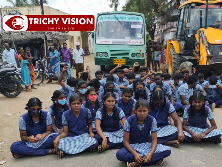 முதுகலை கணித ஆசிரியரை பணியிட மாற்றம் செய்ததற்கு எதிர்ப்பு தெரிவித்து துறையூரில் அரசு பள்ளி மாணவிகள் அரசு பேருந்தை சிறைபிடித்து போராட்டம்.