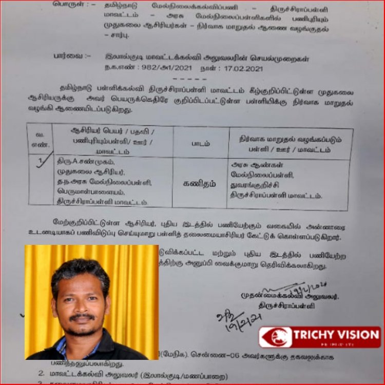 திருச்சி மாவட்டம் துறையூரைச் சேர்ந்தவர் சண்முகம். மாற்றுத்திறனாளியான இவர் முருங்கப்பட்டியில் அரசு பள்ளியில் முதுகலை கணித ஆசிரியராக பணியாற்றி வந்த நிலையில் கடந்த 2019 ஆண்டு துறையூர் பெருமாள் பாளையம் அரசு மேல்நிலைப்பள்ளிக்கு பணியிட மாற்றம் செய்யப்பட்டார்.