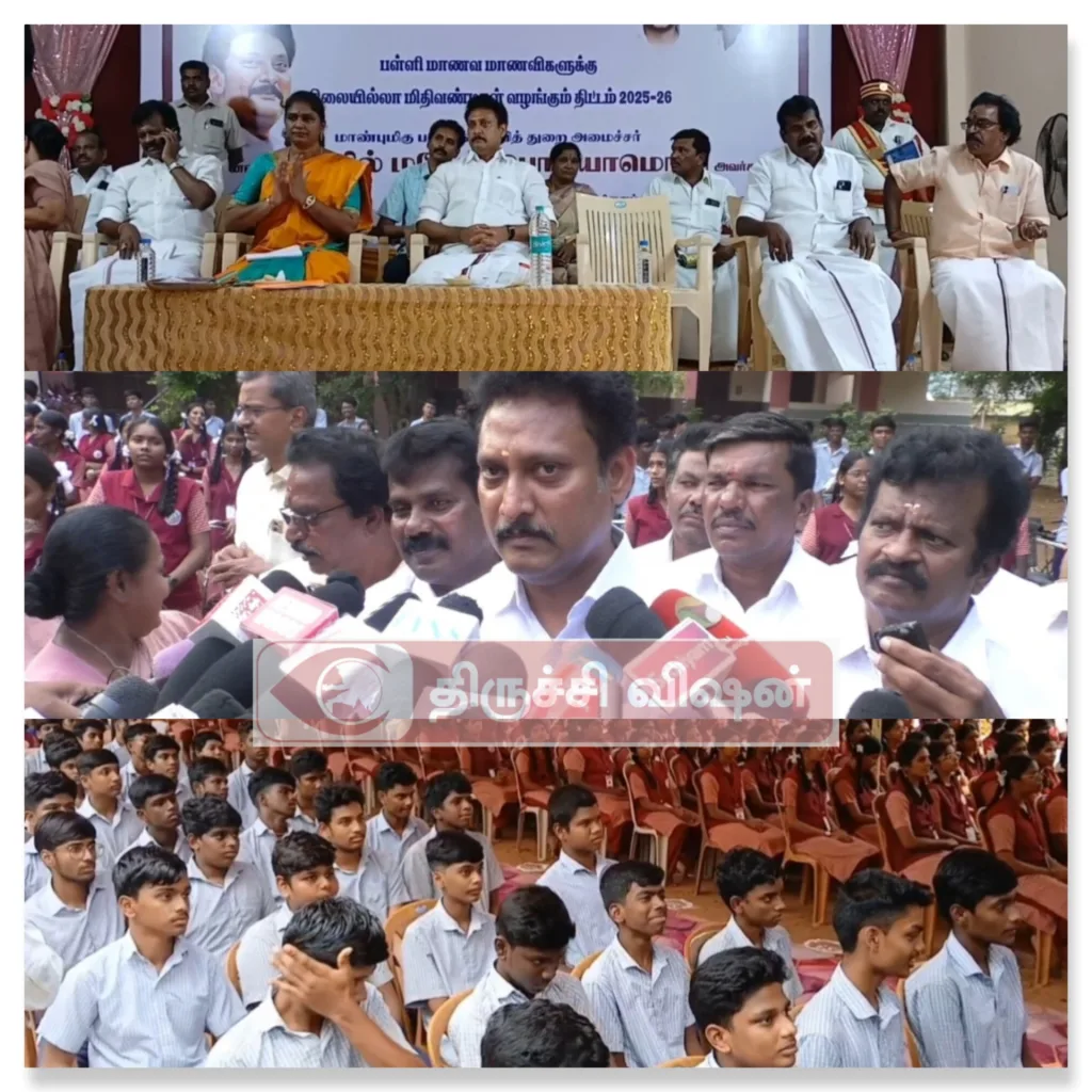 திருச்சி பொன்மலைப்பட்டி பகுதியில் உள்ள புனித வளனார் பெண்கள் மேல்நிலைப் பள்ளியில் விலையில்லா மிதிவண்டிகள் வழங்கும் விழா இன்று நடைபெற்றது இவ்விழாவில் பள்ளி கல்வித்துறை அமைச்சர் அன்பில் மகேஷ் பொய்யாமொழி கலந்துகொண்டு மாணவ மாணவிகளுக்கு விலையில்லா மிதிவண்டிகளை வழங்கினார்.